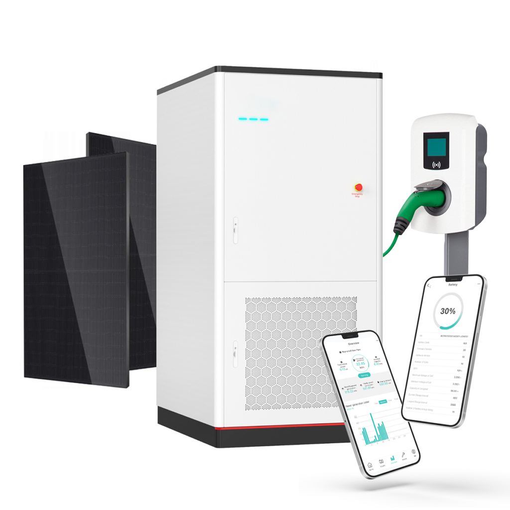 Met onze geïntegreerde energieoplossing helpt u uw bedrijf vooruit op het gebied van duurzaamheid en efficiëntie. Deze totaaloplossing combineert zonnepanelen voor de opwekking van hernieuwbare energie, batterijopslag om overtollige energie slim te bewaren, en laadpalen voor elektrische voertuigen.